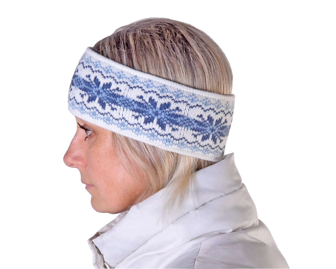 White Jacquard Headband warmer for skiing with reindeer Woollana