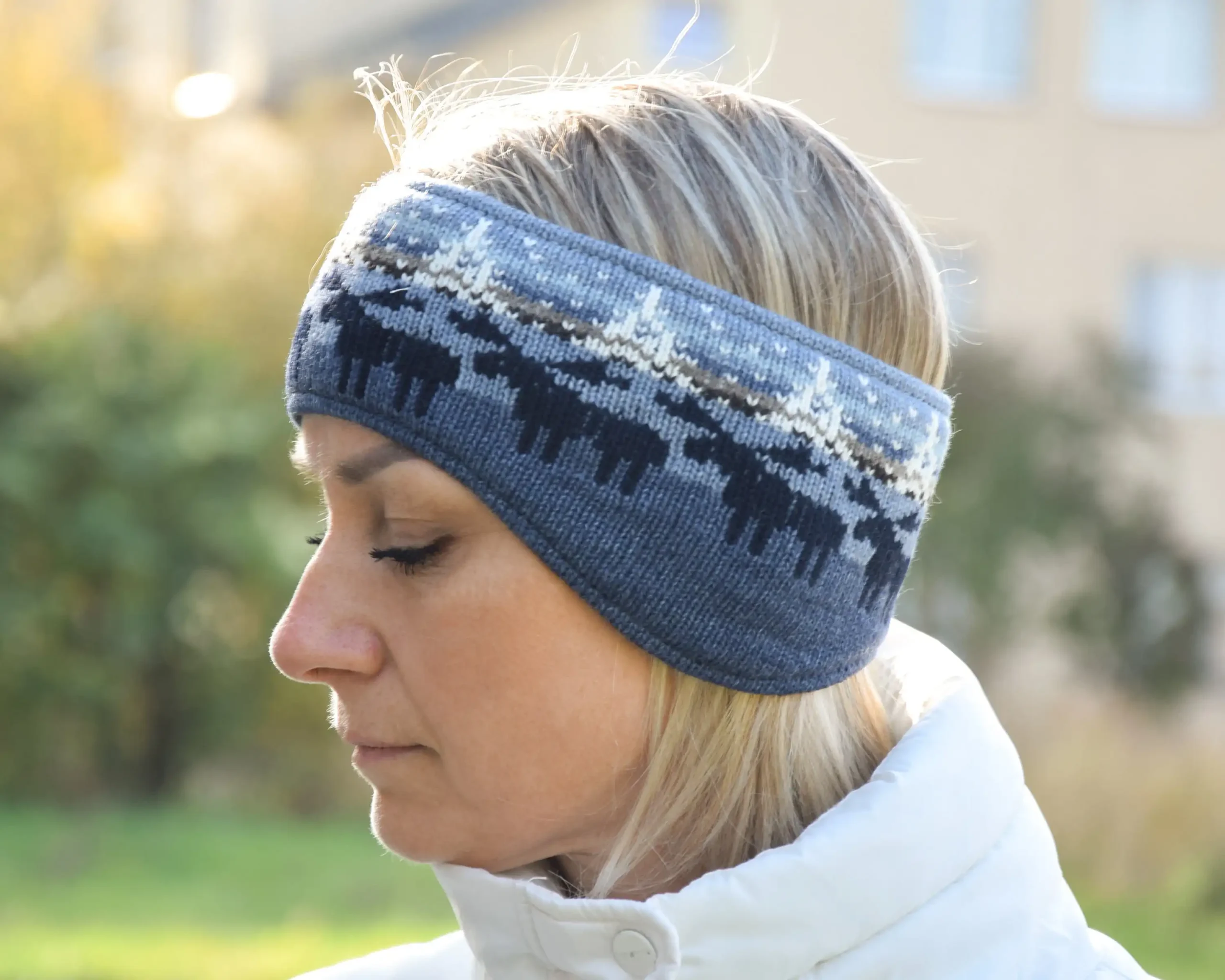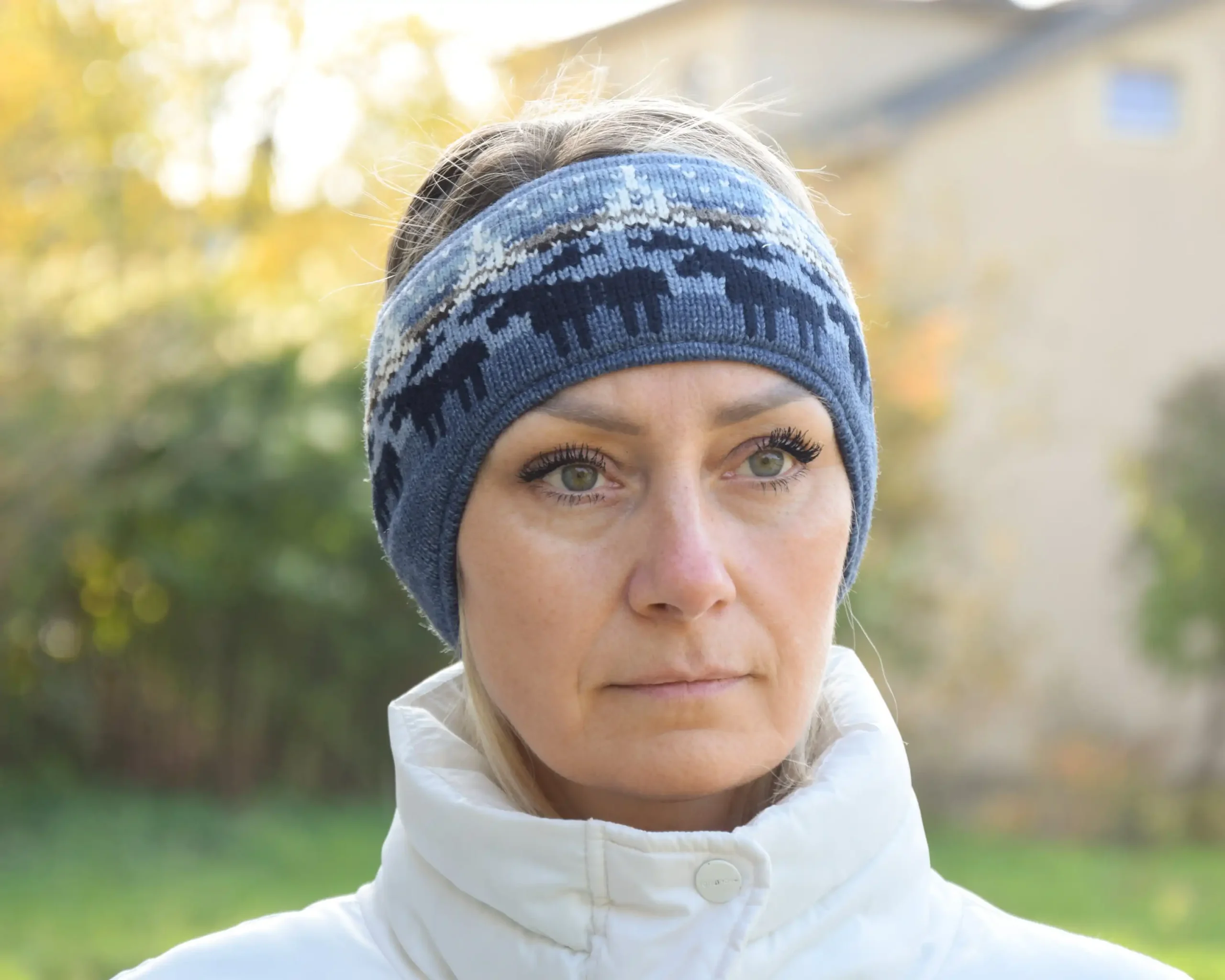 Blue Jacquard Headband with ears warmer with reindeer Woollana