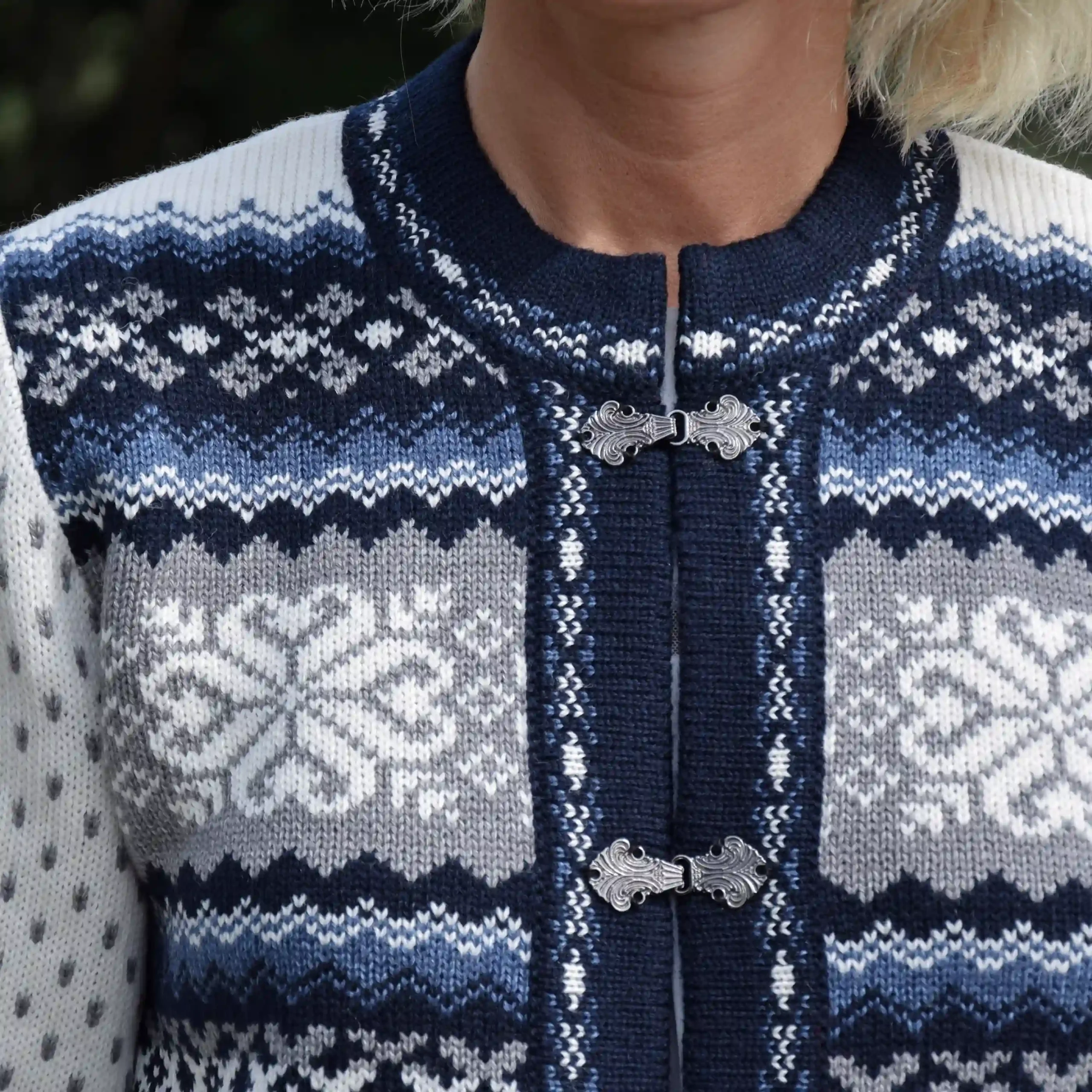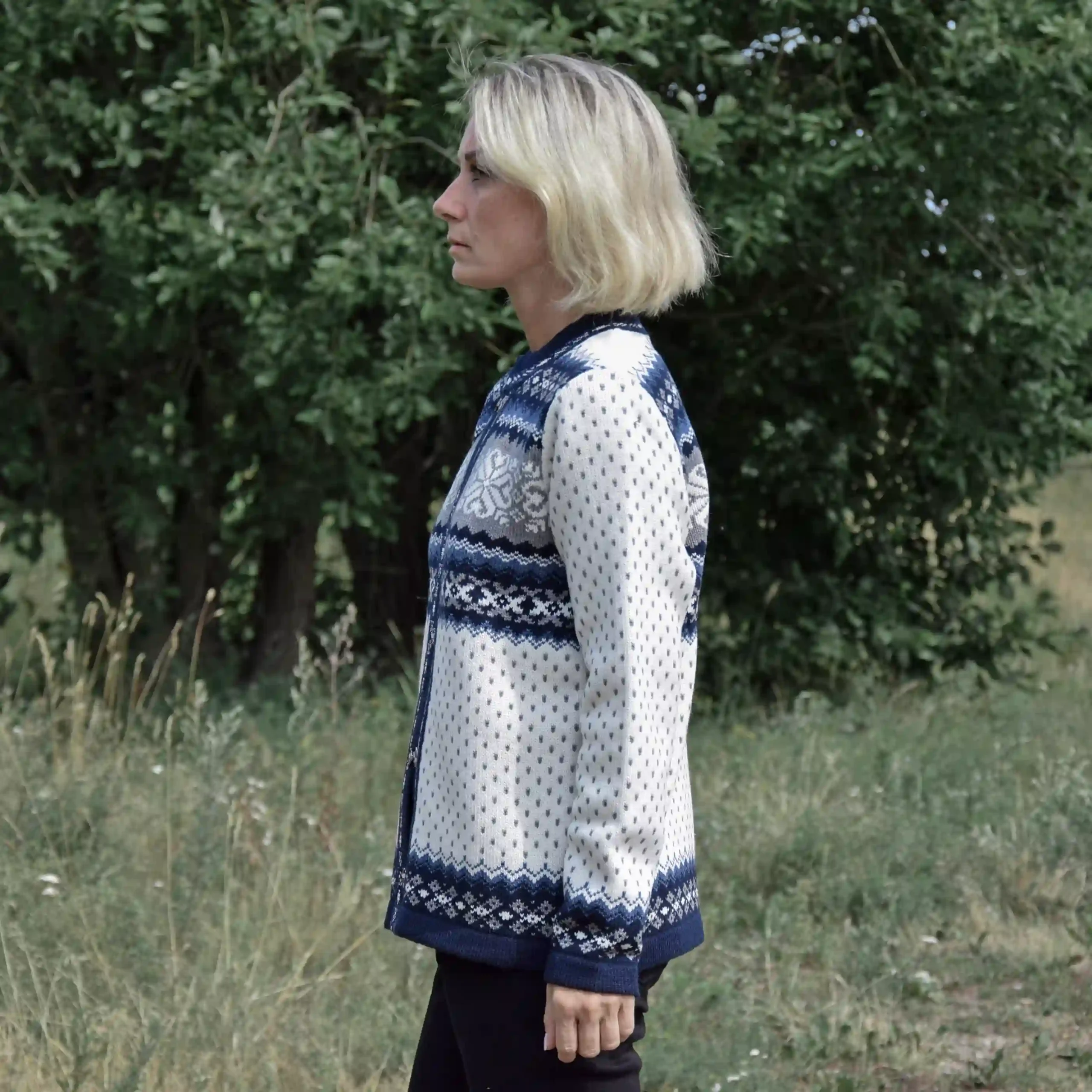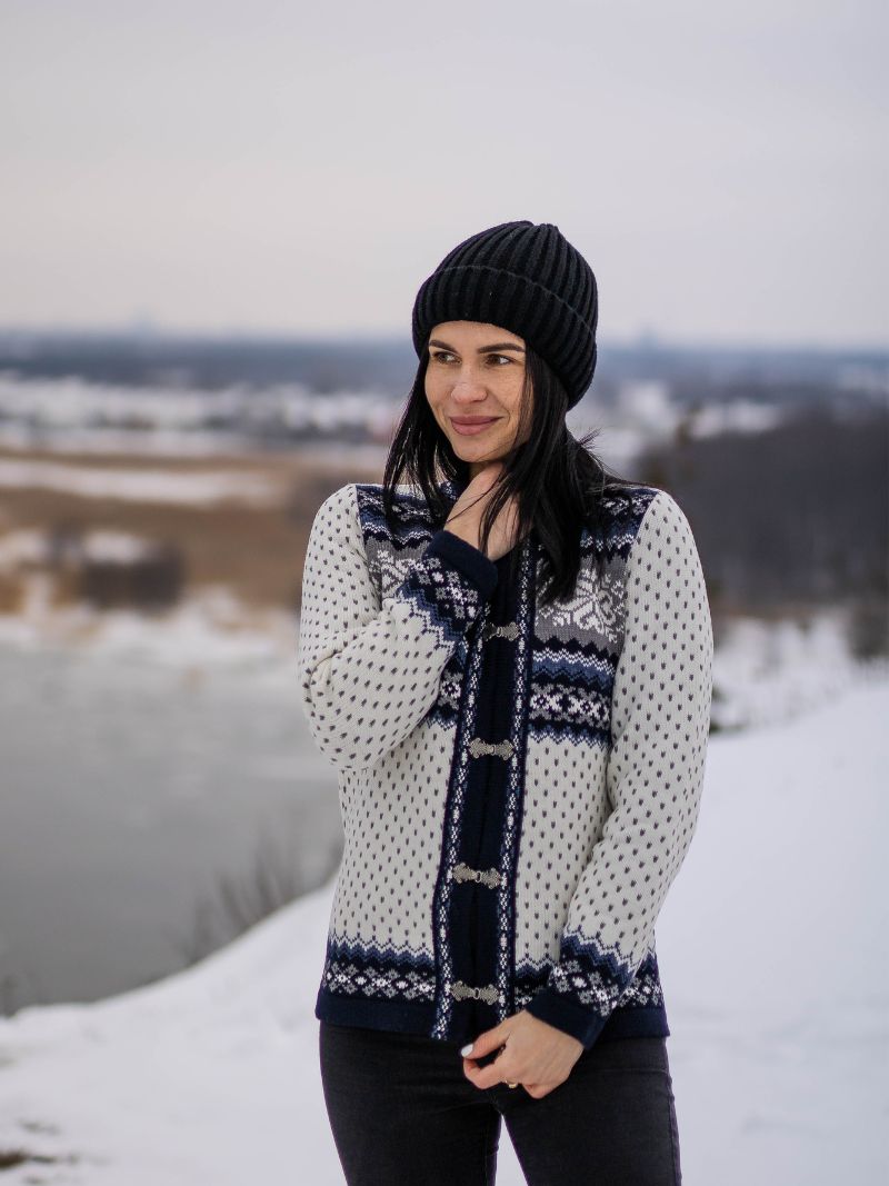 Women’s wool cardigan in white with navy blue Nordic details, handcrafted in Estonia from soft lambswool. This cardigan on frog-closures features traditional Scandinavian patterns and a crew neck, offering a timeless look with cozy winter warmth.