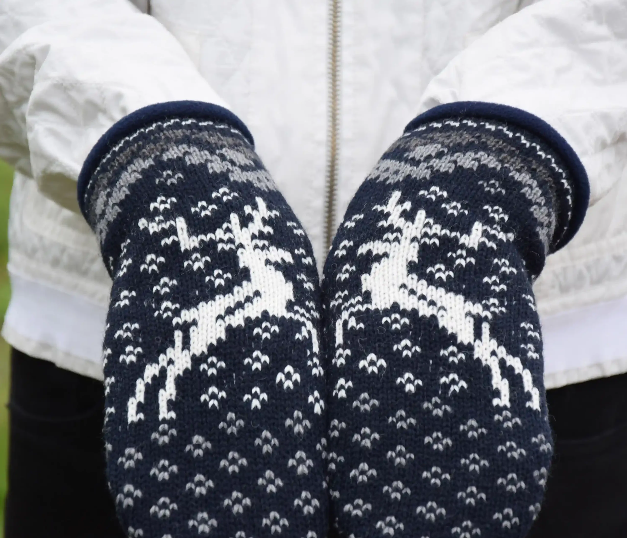 Knitted Navy Mittens fleece-lined Nordic with White Fair Isle pattern and reindeer Traditional Jacquard gloves