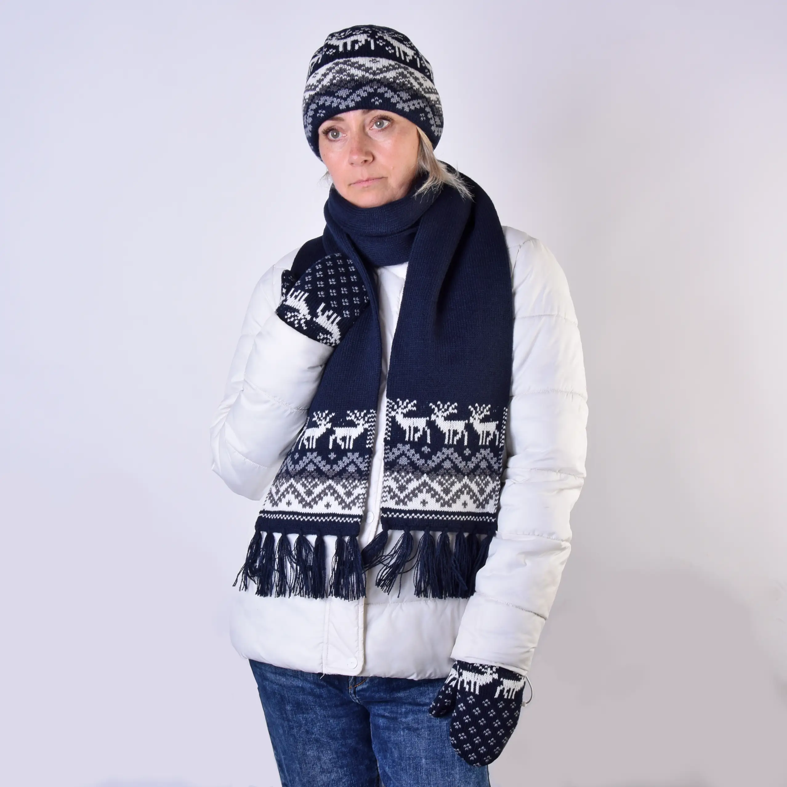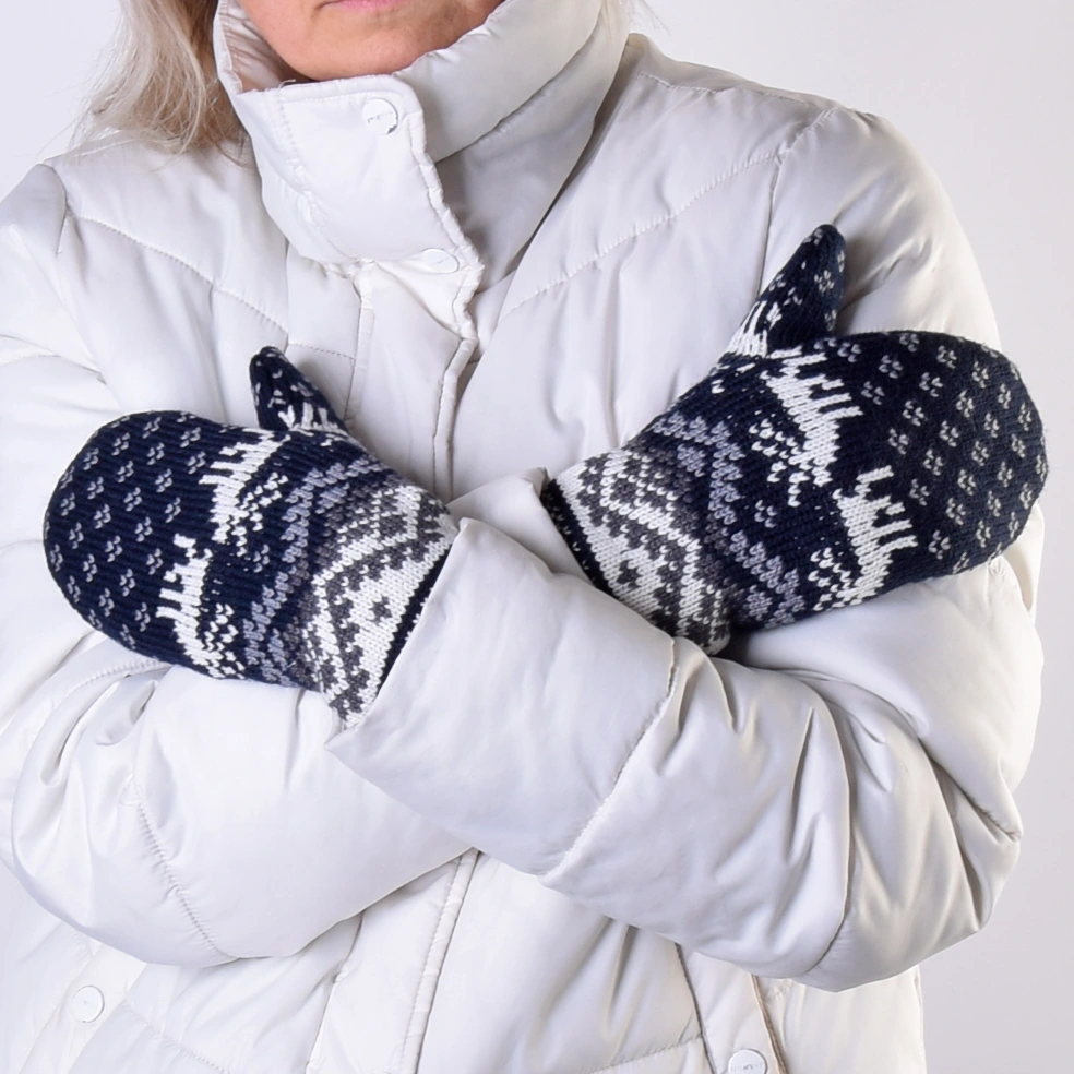 Knitted Navy Mittens fleece-lined with White Fair Isle pattern and reindeer Traditional Jacquard gloves